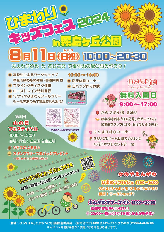 > 【8月11日開催】 かのやばら園無料入園日&ひまわりキッズフェス2024in霧島ヶ丘公園のご案内