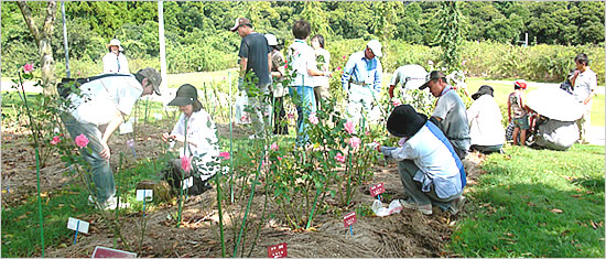 ばら園内の市民ガーデンに、バラの苗木を植えます。